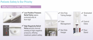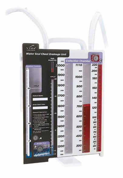Vide’s water seal chest drainage unit is a 2000ml sterile disposable three chamber chest drain. It is designed as a single collection unit used to remove air and fluid from patient’s intrapleural cavity, as a result of pneumothorax , hemithorax, mediastinal shift or other complications that affect the normal breathing resulting from a loss in intrapleural negative pressure.